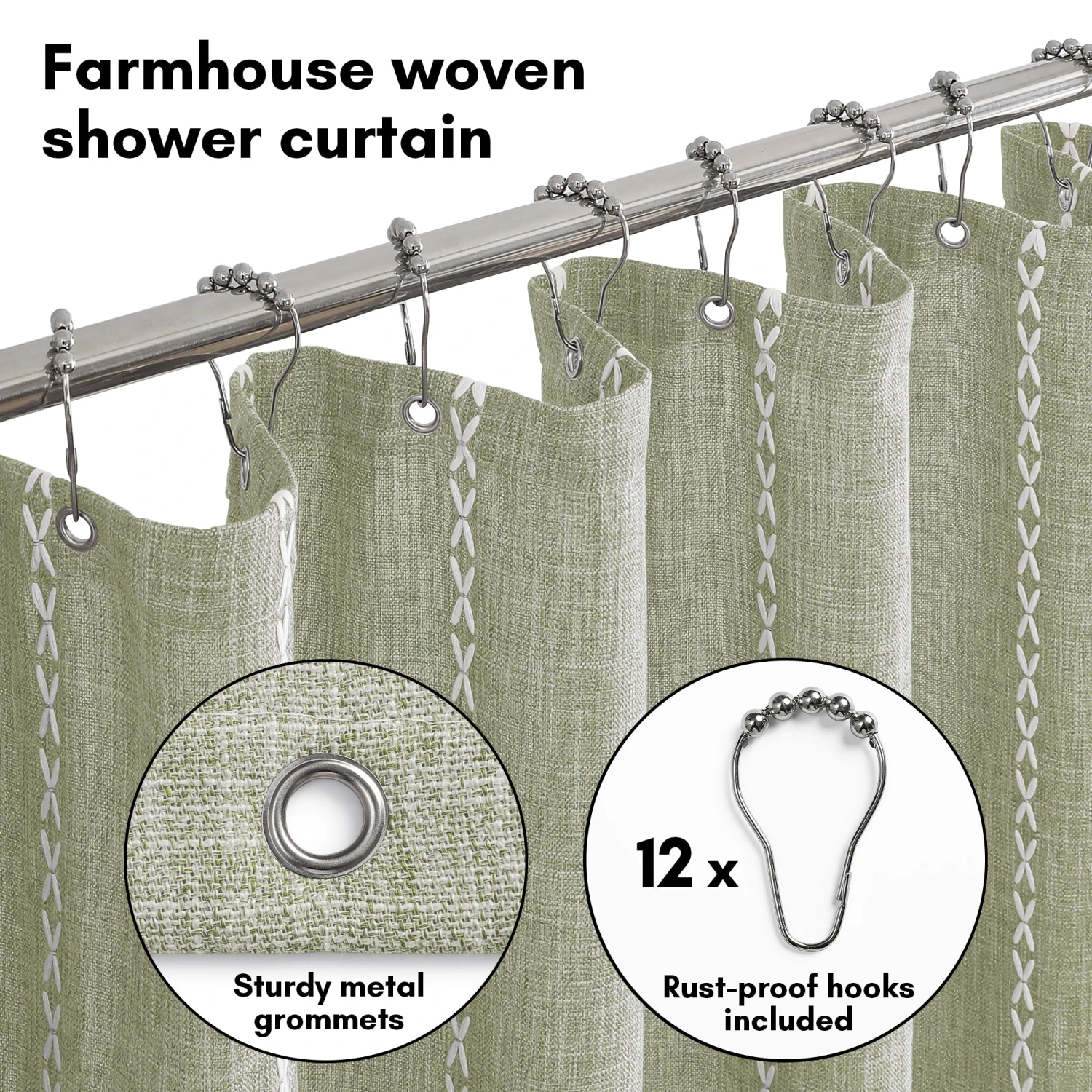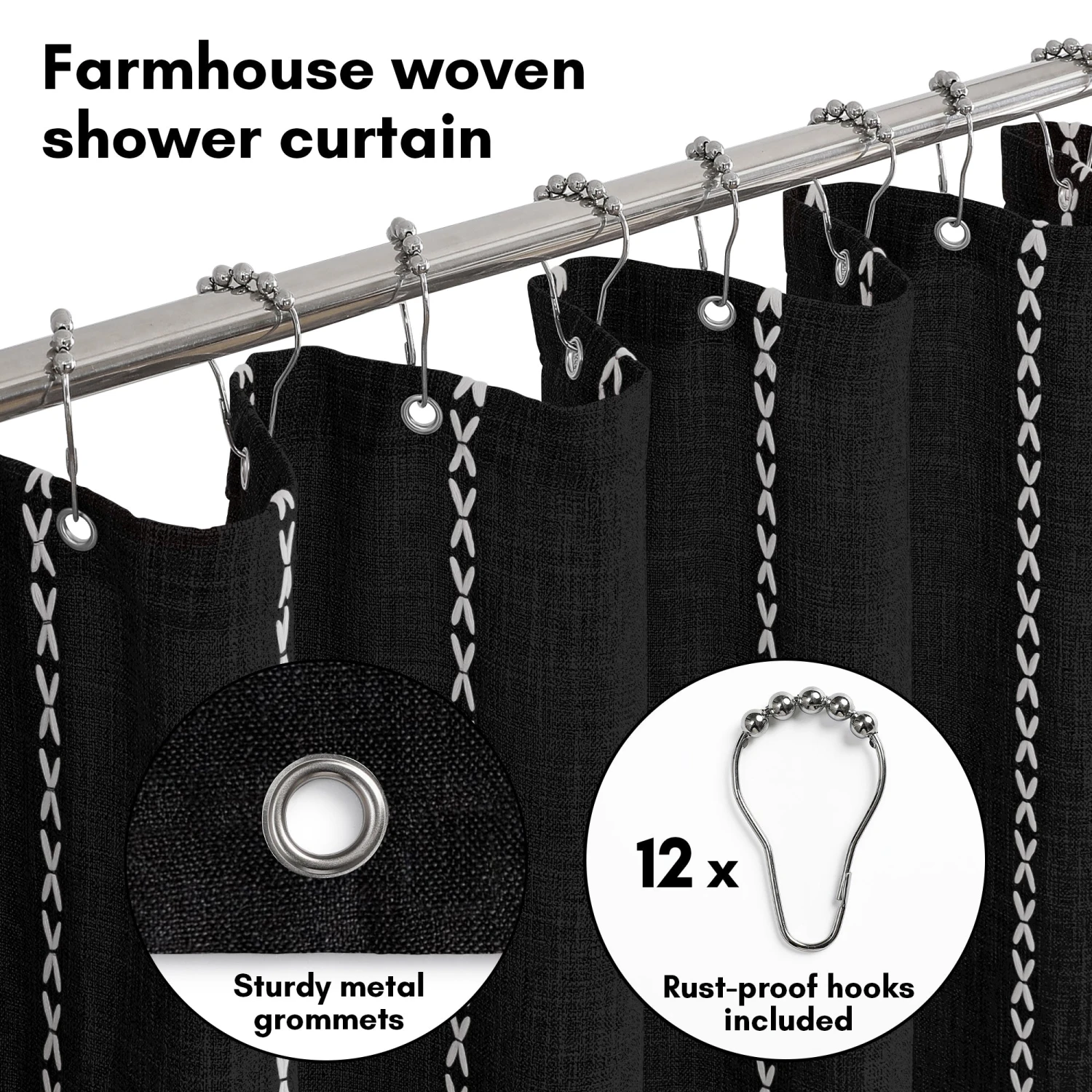 - Includes 12 grommets and 12 plastic hooks