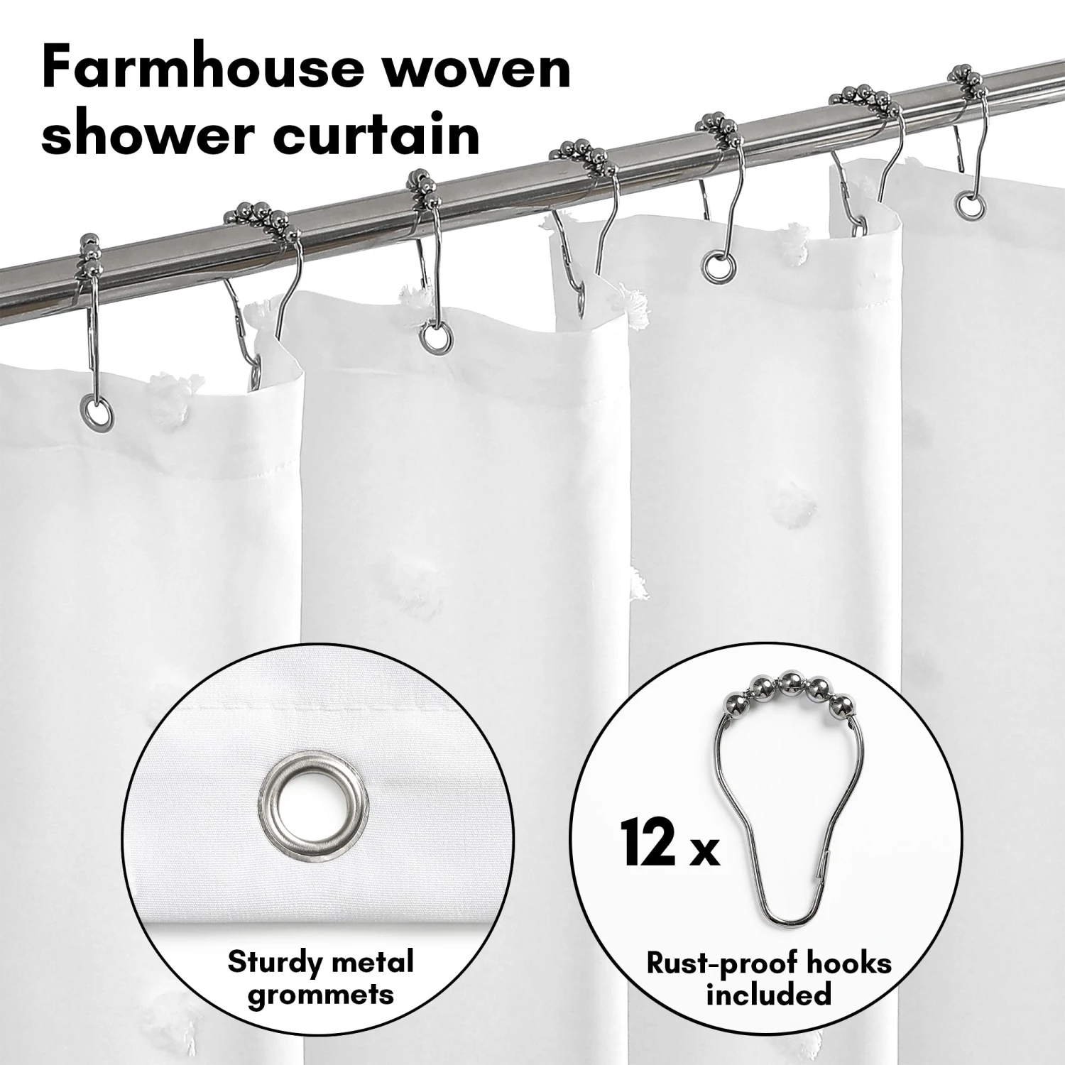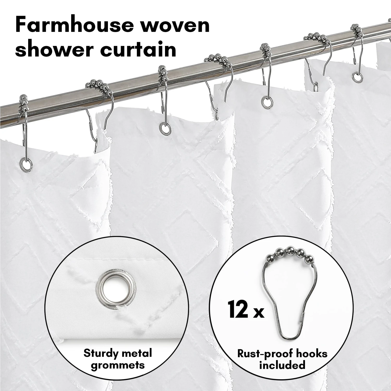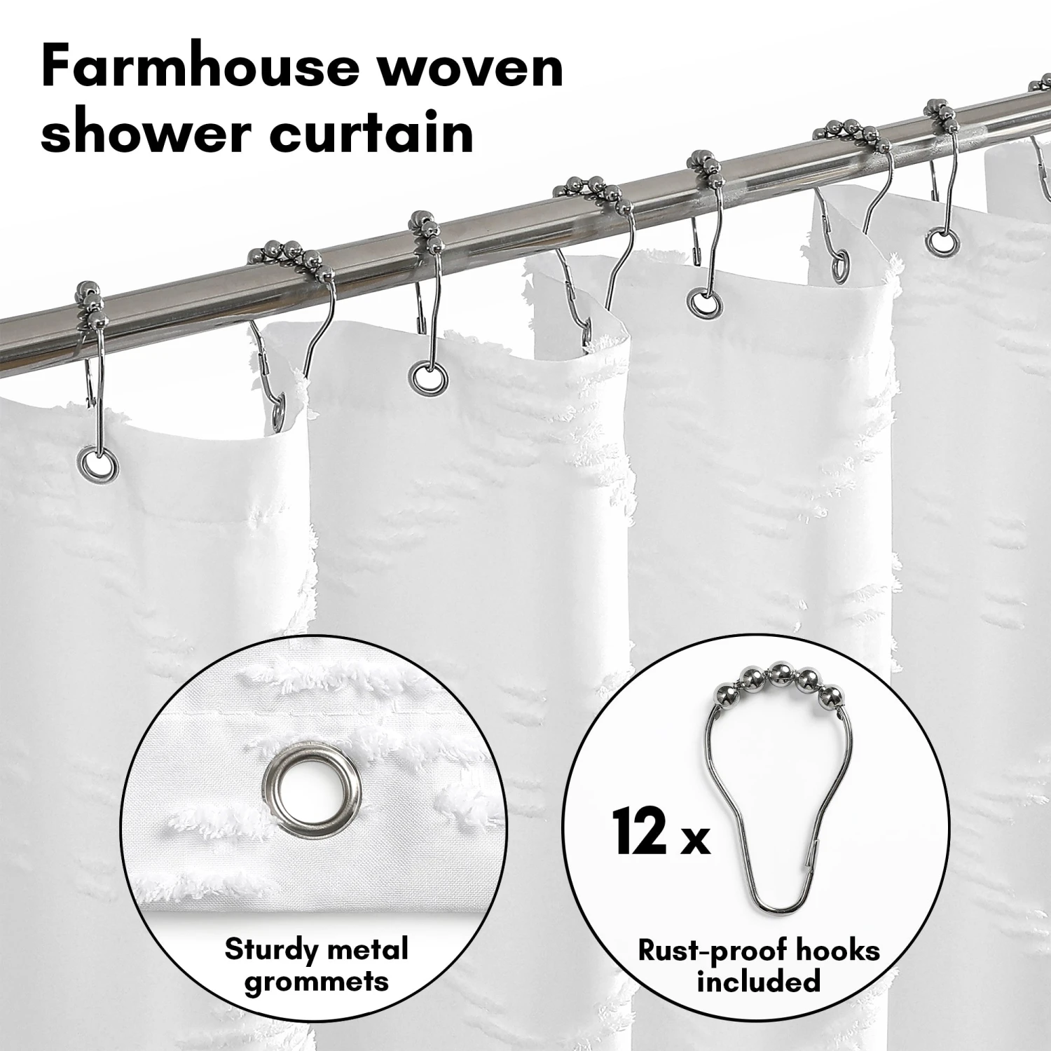 Make a bold statement in your bathroom with this textured woven linen shower curtain. The classic white color, textured patterns, vertical stitched detailing, and tassel accents add subtle depth and a modern feel, elevating your space instantly. Whether you’re tackling the morning madness or winding down with your favorite playlist, this bath curtain is crafted from water-resistant material, easy to hang, a breeze to wipe clean, and impossible not to love. Perfect for anyone looking to give their space a quick refresh, it’s a stylish and practical bathroom shower curtain that makes even everyday routines feel a little more enjoyable.
