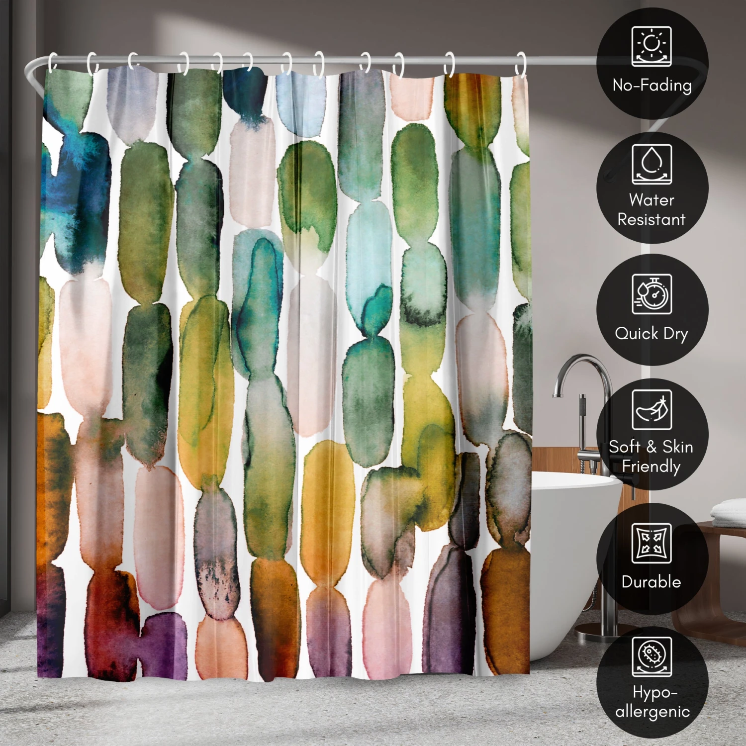Bring a sense of calm and creativity to your bathroom with this bold, abstract shower curtain designed by Lisa Nohren. Watercolor strokes in earthy greens, muted pinks, and deep autumn hues create a relaxed, modern feel that instantly transforms your space. Whether you’re tackling the morning madness or winding down with your favorite playlist, this bath curtain is crafted from water-resistant material, easy to hang, a breeze to wipe clean, and impossible not to love. Perfect for anyone looking to give their space a quick refresh, it’s a stylish and practical bathroom shower curtain that makes even everyday routines feel a little more enjoyable.