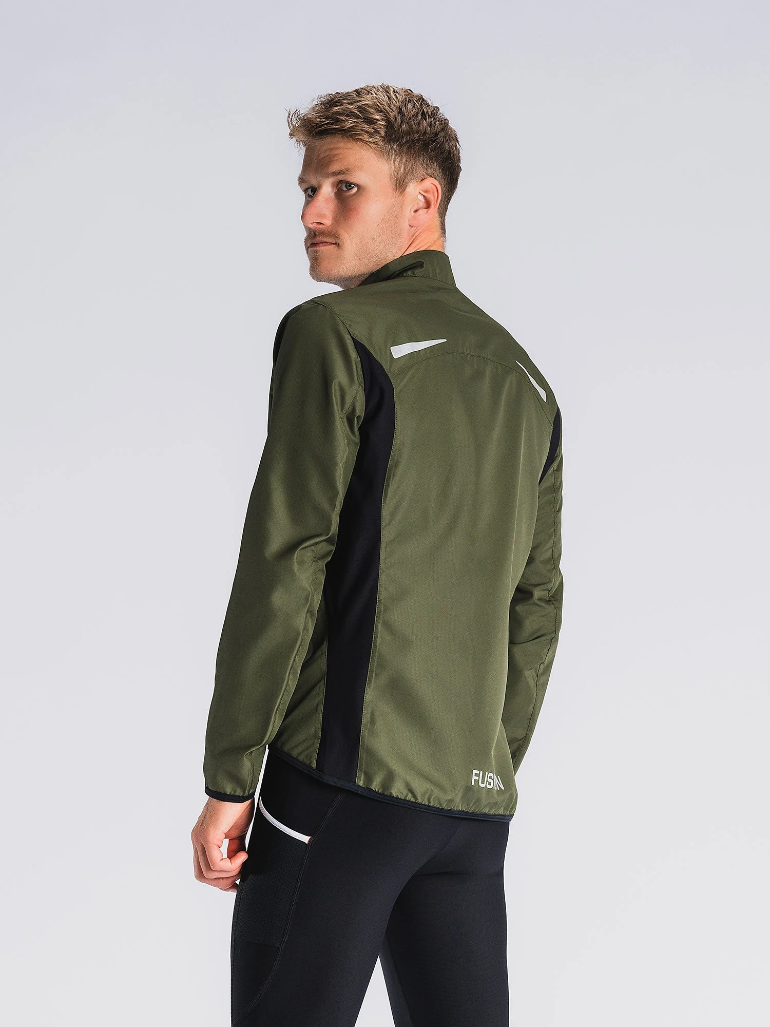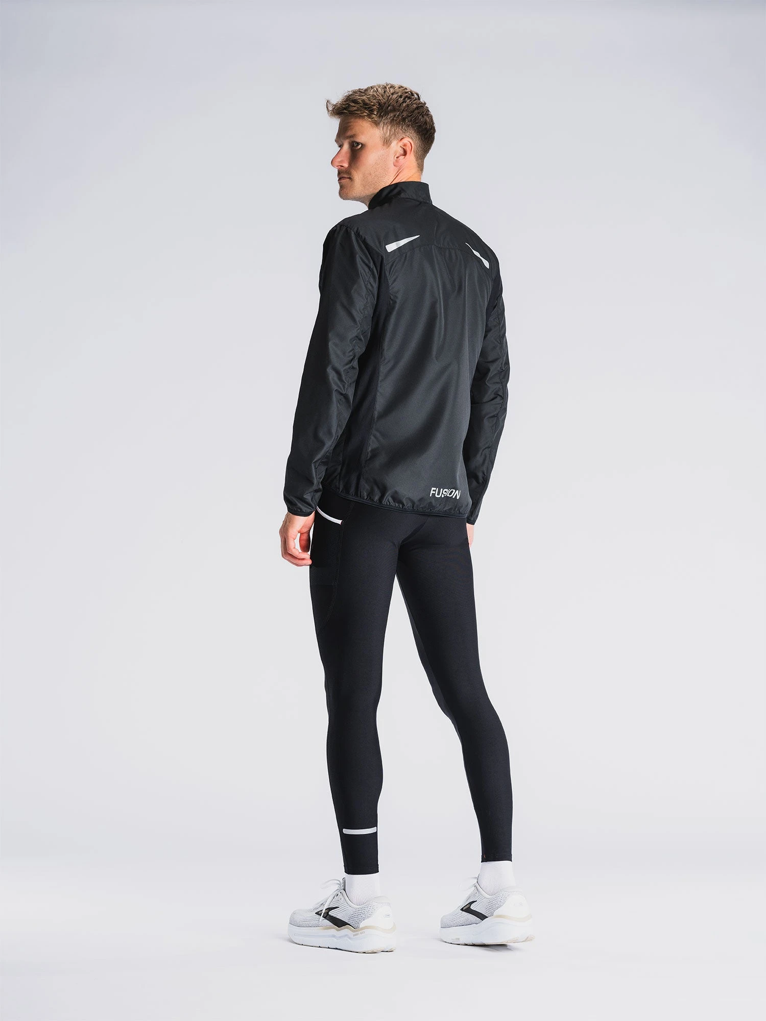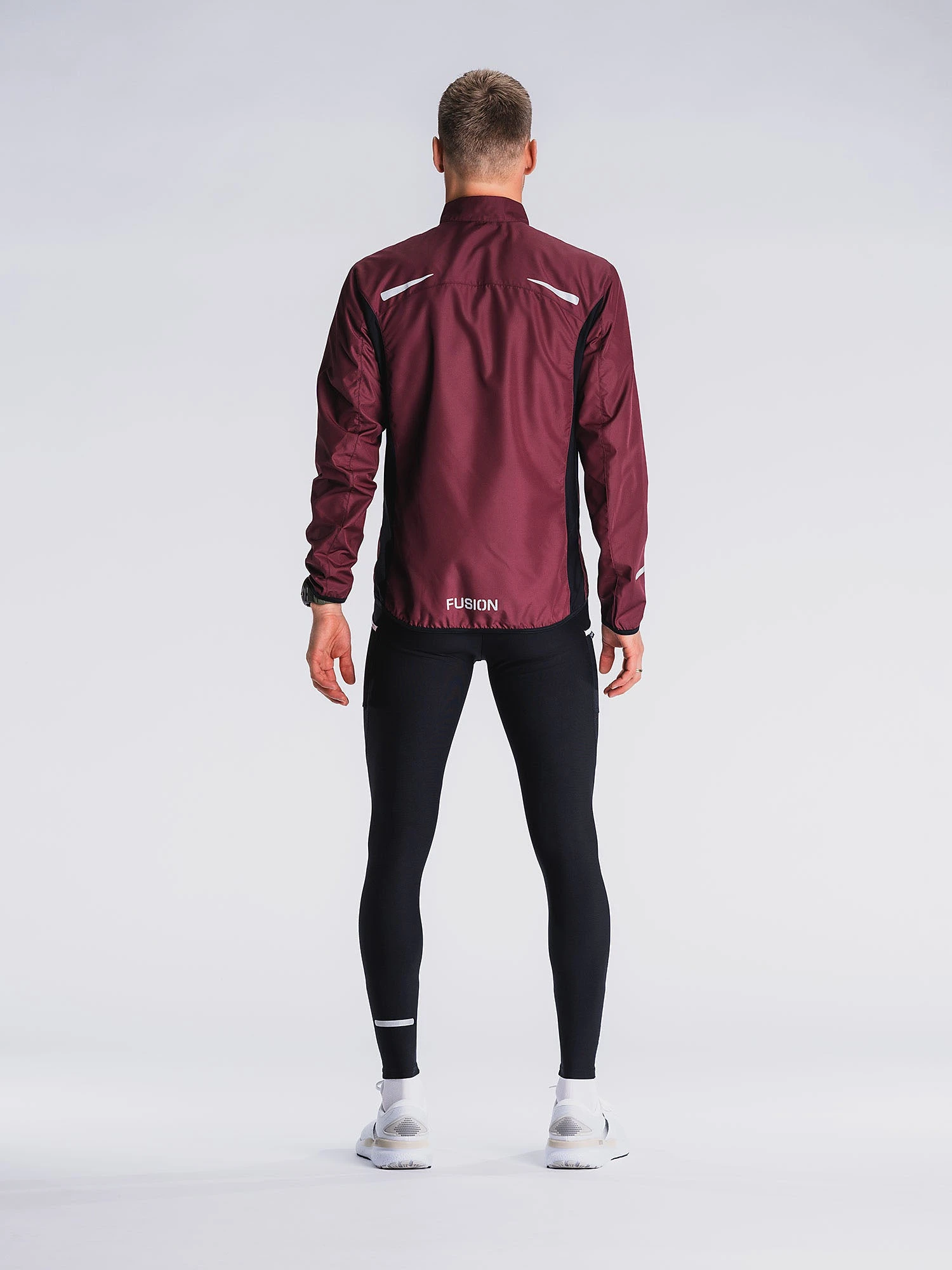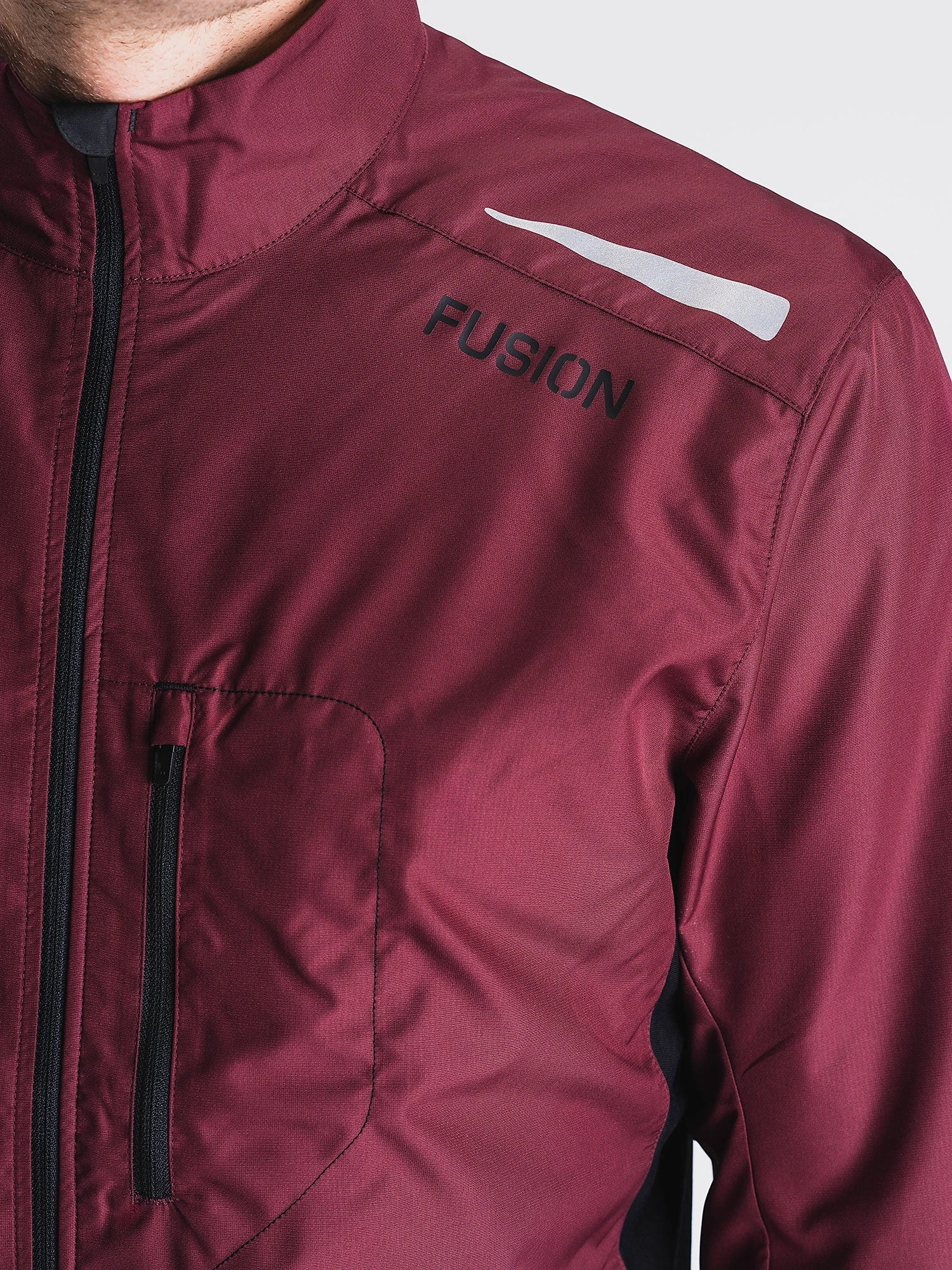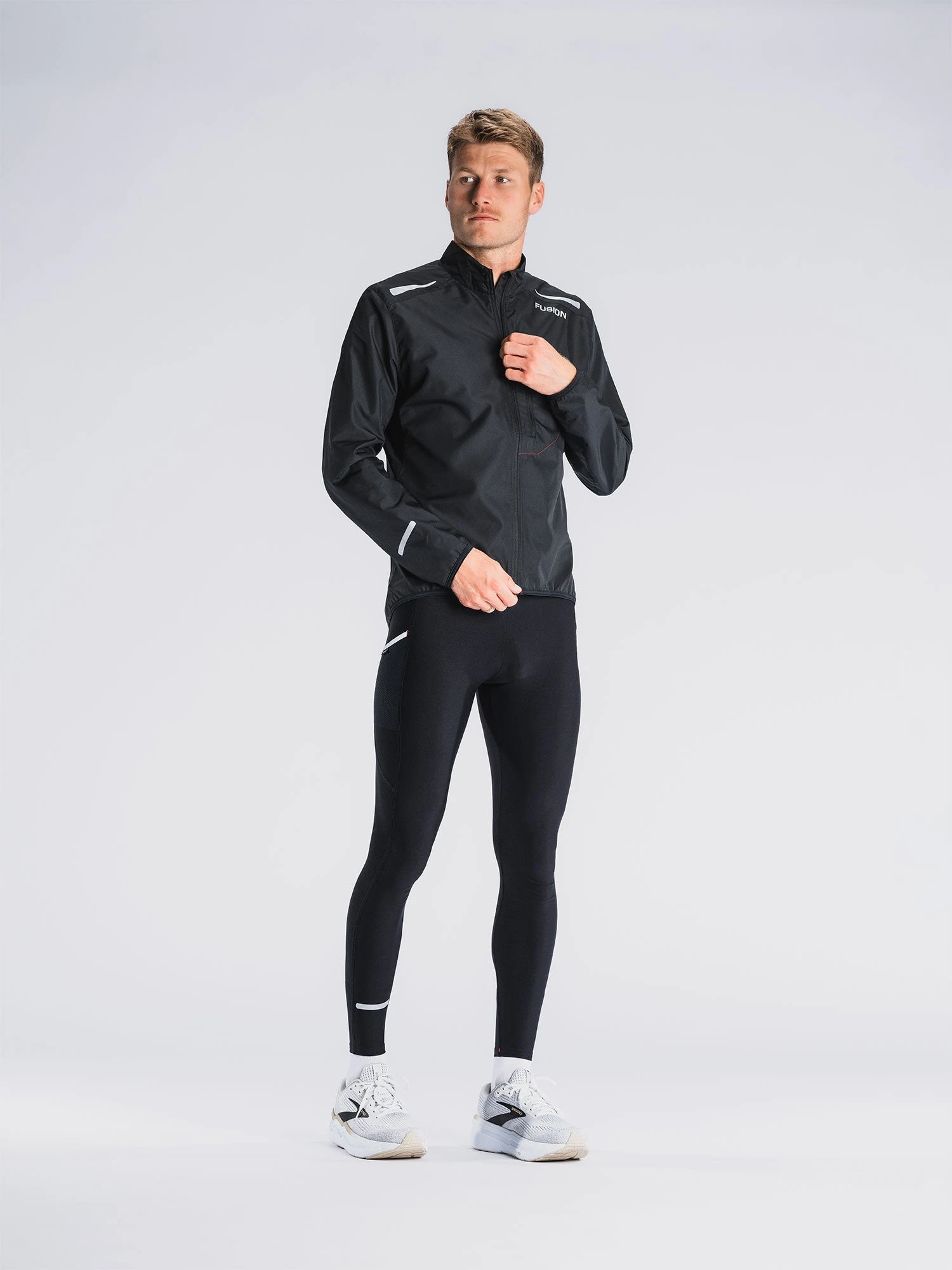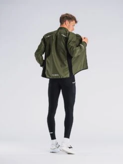Løbejakkens strækbare sidepaneler sikrer en behagelig løbeoplevelse og effektiv ventilation i den moderat tætsiddende jakke. Kravens inderside er blød og svedtransporterende.