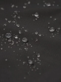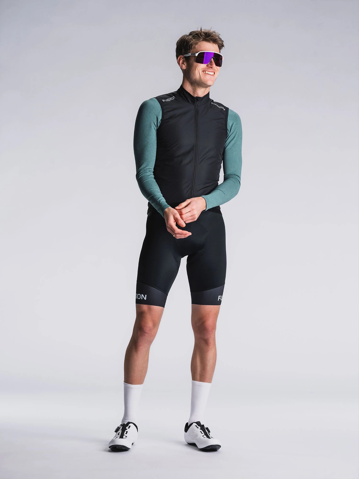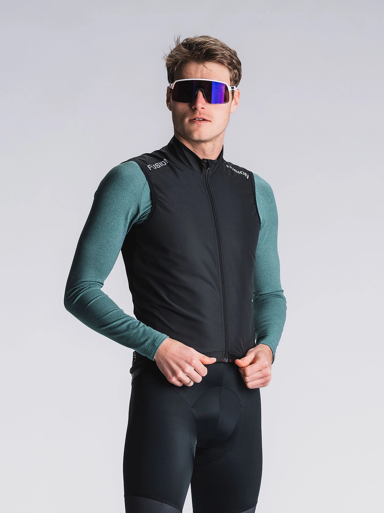 Vestens front er vindtæt og vandafvisende. Ryggen består af et højelastisk, åndbart mesh-panel, der strækker sig helt op i kraven, så vesten i cykelposition er tætsiddende med behagelig pasform uden at stramme. Kravens inderside er blød og svedtransporterende. Vesten har en robust lynlås med vindtæt bagside og er forneden afsluttet af et elastisk silicone grip.